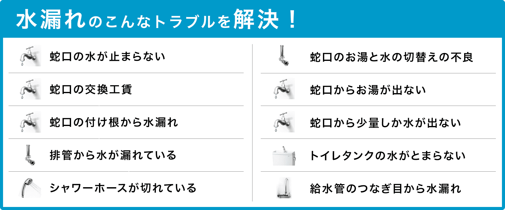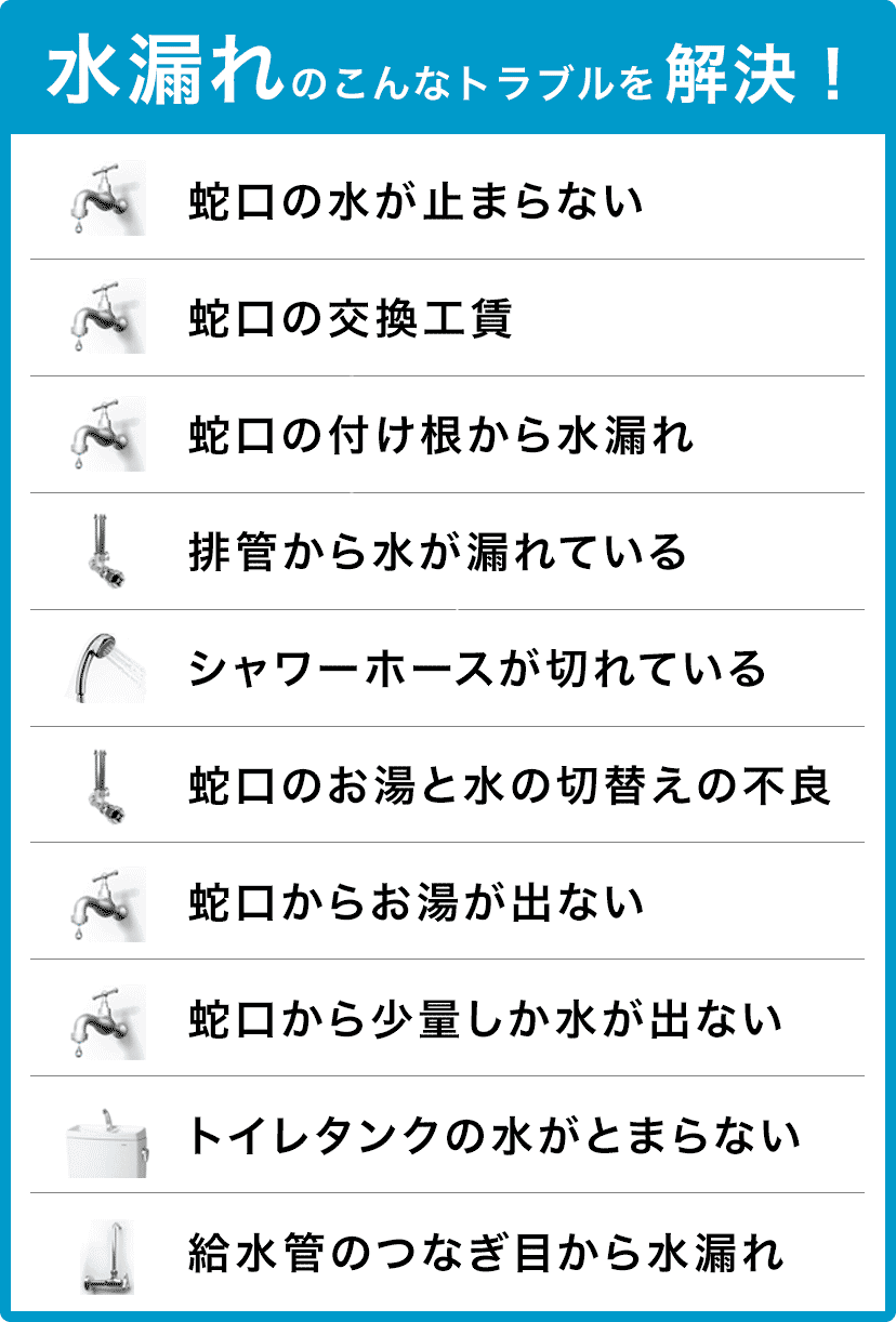 水協では、お客様のご要望に応じて、24時間365日いつでも対応しております。 休日や深夜の対応であっても、追加料金(休日料金・深夜料金など)は一切いただいておりませんので、どうぞご安心ください。 水回りのトラブルには、最寄りの営業所から最短15分で駆けつけ、原則として即日工事にてスピーディーに対応いたします。